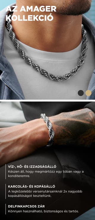 A kötéllánc klasszikus, enyhén texturált darab, amely finoman mozogva visszaveri a fényt. Jól illik pólóhoz vagy galléros dzsekhez, önmagában is mutatós, és jól rétegezhető más nyakláncokkal. Formája közel simul a nyakhoz, ezért kényelmes a mindennapi viseléshez.