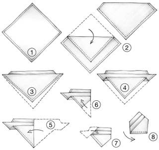 - Fordítsd meg a zsebkendőt, majd hajtsd fel azt a két szélső csúcs vonalára harmonikaszerűen.